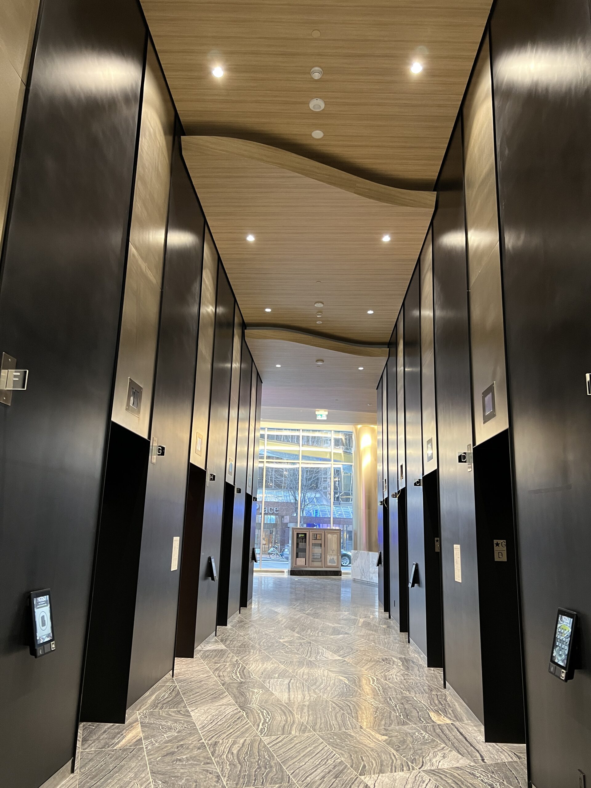 The B6 office tower located at 1090 W Pender Street, Vancouver boasts AAA office space overlooking Coal Harbour and Stanley Park.  This design assist project includes 7 levels of underground parkade, 33 storeys of office space, commercial retail spaces, numerous exterior terraces, penthouse amenity space and meeting rooms, end-of-trip facilities, and an expansive fitness room with 42’ ceilings!  This stunning tower for BentallGreenOak features a large curved LED screen AV wall along with matching curved LED cove lights in the main lobby.  With the design assist delivery model, Bridge provided real-time pricing of contemplated options for the owner and design team to make timely decisions and focus on what mattered most.  B6 is designed to meet WIRED, WELL Building, and LEED Gold building standards.  The electrical systems integrate with a Smart Building app.  Some of the notable features on this project include: