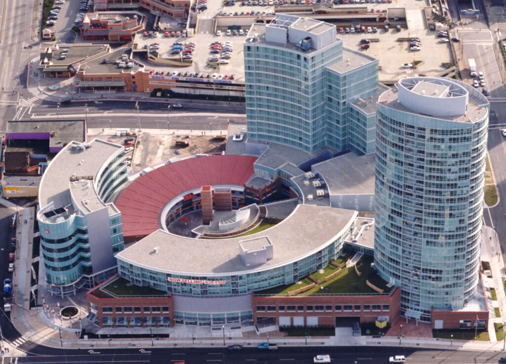 Multi-use complex with circular and elliptical grid layout, four levels of underground parking, full service Hilton convention hotel, indoor two level retail mall, multi-level office building, and high rise/low rise residential towers.