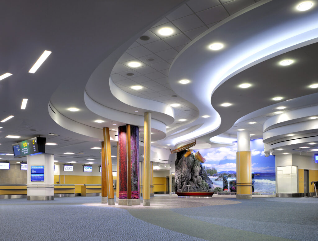 Features of the project include a “Log Jam” lighting arrangement as you exit the customs hall. In front of the rock wall feature, you will see canoes travelling down a river made of LED lighting and drywall bulkheads.