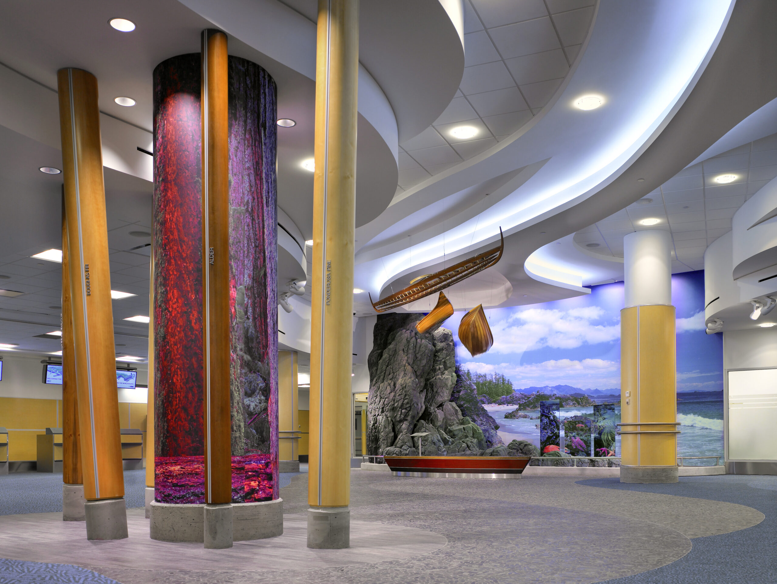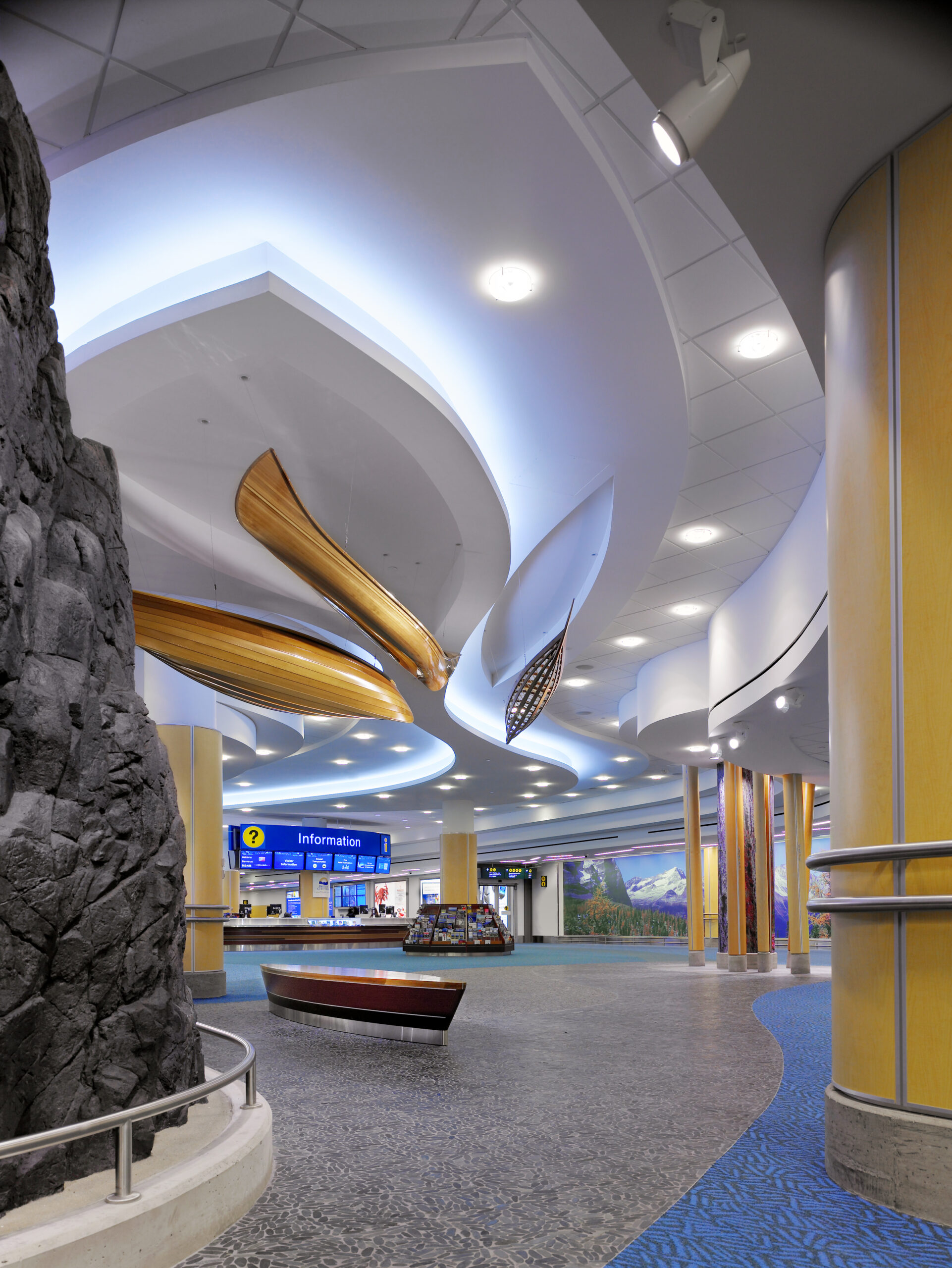 Features of the project include a “Log Jam” lighting arrangement as you exit the customs hall. In front of the rock wall feature, you will see canoes travelling down a river made of LED lighting and drywall bulkheads.